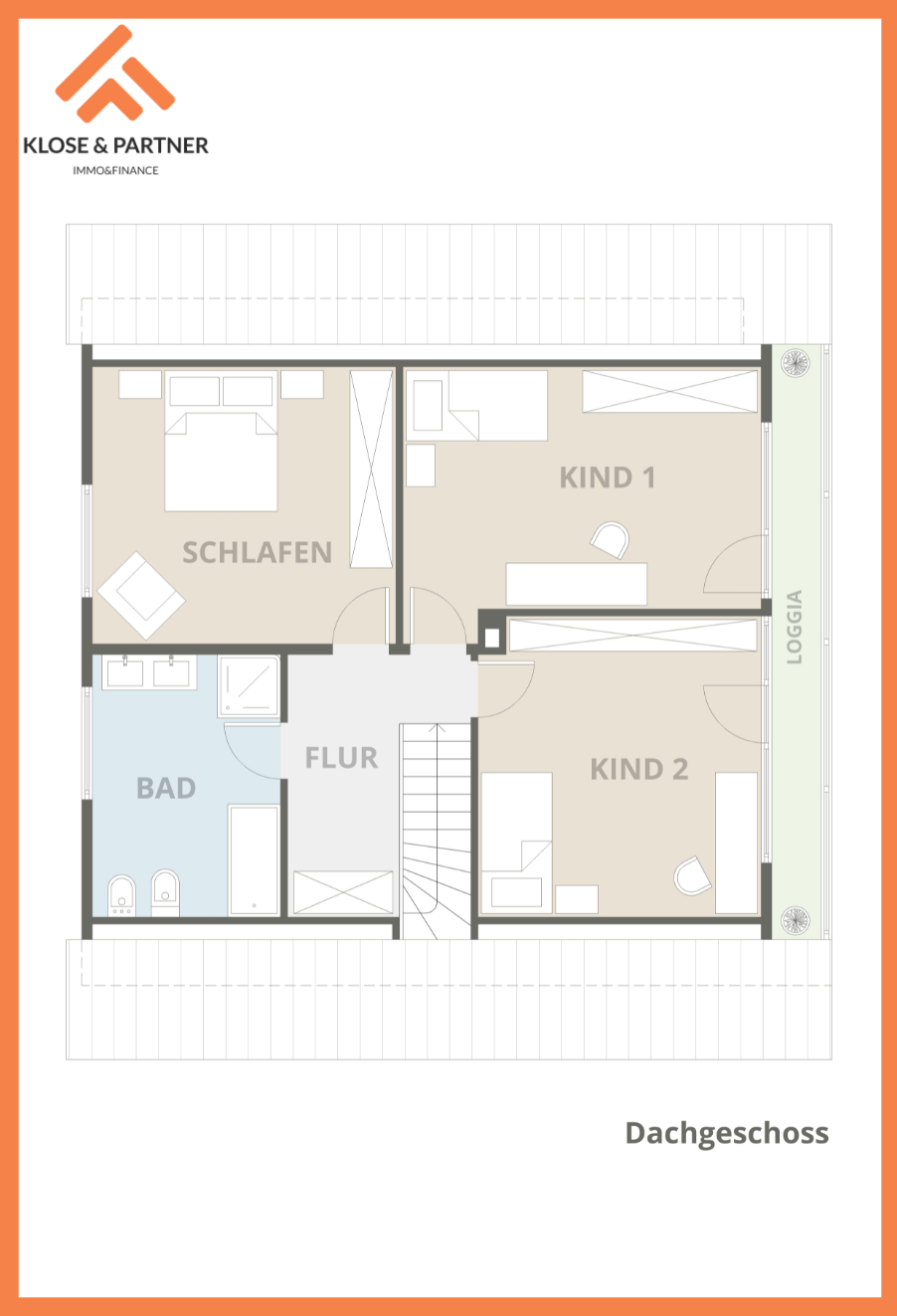 • Drei Schlafzimmer im Obergeschoss, zwei davon mit Zugang zur verglasten Loggia (Giebelverglasung über beide Zimmer, komplett zu öffnen)